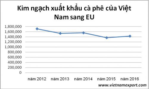 Trong giai đoạn 2012-2016, kim ngạch xuất khẩu cà phê đạt khoảng trên 1 tỷ USD/năm, có xu hướng giảm về kim ngạch. Năm 2016, kim ngạch xuất khẩu cà phê của Việt Nam sang EU đạt 1,43 tỷ USD, tăng 4,51% so với cùng kỳ năm ngoái.