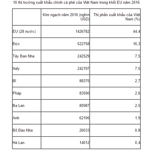 Về thị trường, năm 2016, Đức, Tây Ban Nha, Italy là 3 thị trường nhập khẩu cà phê lớn nhất trong khối EU của Việt Nam, chiếm 31,3% thị phần.