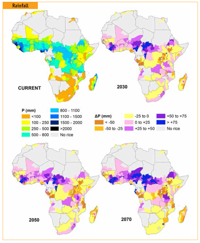 Dự báo lượng mưa rất đa dạng; lượng tăng vào mùa mưa chủ yếu ở Trung Phi (Nigeria, Niger, Chad, và South Sudan) và phía bắc Ethiopia giảm dần ở Đông Phi và Madagascar ở tất cả các kịch bản RCPs. Nhiệt độ tăng tối đa sẽ tăng ở hầu hết các quốc gia theo các kịch bản RCP khác nhau, ở các mức độ khác nhau. Nhiệt độ tăng mạnh nhất được dự đoán ở Mali và các vùng biên giới tại Burkina Faso, nơi nhiệt độ trung bình hiện nay đang ở mức cao, dao động từ 30 độ C đến 41 độ C trong mùa sinh trưởng của cây lúa. Khu vực nhiệt độ tăng cao thứ hai là vùng trải dài từ Ethiopia đến Zimbabwe. Nhiệt độ tăng ở vùng cao của các nước này có thể tạo ra các cơ hội mới cho người nông dân trồng lúa.