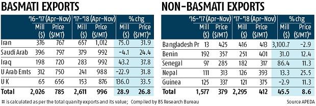 Xuất khẩu gạo basmati và non-basmati đều tăng mạnh, với giá gạo basmati (đặc biệt là loại 1401 và 1121) tăng 26,8% trên thị trường xuất khẩu. Đứng trước cơ hội này, diện tích trồng vụ rabi đã tăng 633.000ha so với cùng kỳ năm ngoái. Diện tích gieo trồng lúa Ấn Độ đạt 2,23 triệu ha trong năm 2017. Trên thị trường quốc tế, giá gạo Thái Lan và Việt Nam cũng tăng, trước triển vọng xuất khẩu sang Indonesia và Philippines.