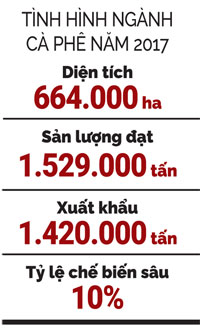 Bộ NNPTNT cho biết, diện tích cà phê năm 2017 đạt 664,6 nghìn ha, tăng 14,1 nghìn ha (+2,2%); năng suất tăng 3,1%; sản lượng đạt 1.529 nghìn tấn, tăng 68,9 tấn (+4,7%) so 2016. Xuất khẩu cà phê năm 2017 đạt 1,42 triệu tấn với giá trị 3,21 tỷ USD, giảm 20,2% về khối lượng và giảm 3,8% về giá trị so với cùng kỳ năm 2016.