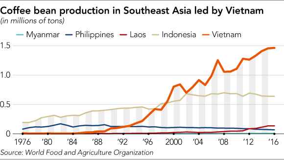 Việt Nam là ngôi sao đang lên. Sản xuất cà phê tại Việt Nam có hệ số tăng 58 trong 30 năm qua. Việt Nam đã vượt qua Indonesia và Philippines vào thập niên 1990s và trở thành nước sản xuất cà phê lớn thứ hai thế giới, sau Brazil. Lào cũng đang tăng vị thế sản xuát cà phê, với sản lượng tăng hơn gấp đôi, lên 140.000 tấn trong 5 năm vừa.