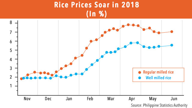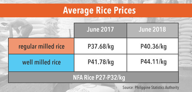 Giá gạo thường chạm mốc cao nhất vào tuần thứ 2 của tháng 4, ở mức 1,99 USD/kg, tăng 7,88% so với cùng kỳ ăm 2017. Trong khi đó, giá gạo xát bóng trung bình chạm mức cao nhất 2,19 USD/kg vào tháng 6, tăng 5,58% so với cùng kỳ năm 2017. Giá gạo tại Philippines bắt đầu tăng vọt từ tuần cuối cùng của tháng 3. NFA thông báo hồi tháng 4 rằng họ cạn kiệt nguồn gạo dự trữ.