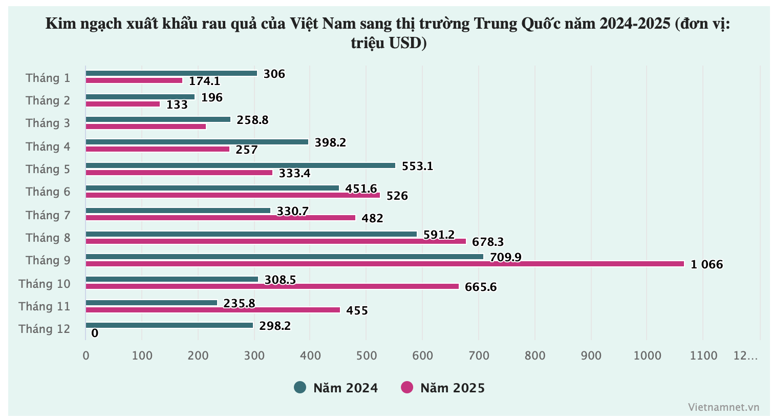 Tháng 10 và tháng 11 vừa qua, xuất khẩu rau quả sang thị trường Trung Quốc tiếp tục tăng trưởng mạnh: tháng 10 đạt 665,6 triệu USD, tăng gấp đôi so với tháng cùng kỳ năm ngoái; tháng 11 cũng tăng gần 93%, đạt 455 triệu USD.